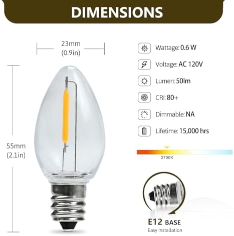 - 5 Base String Bulbs: The light accessory cord with C7 candelabra light bulbs has brighter 50 lumen lightness and lower temperature, E12 candelabra base, C7 candle light bulbs fit for most craft objects, creating a warm and relax atmosphere for you.