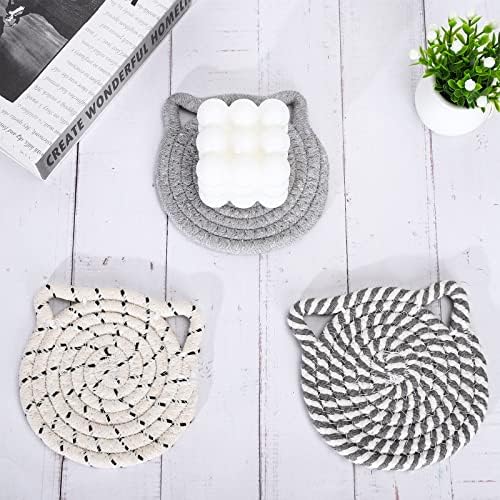 Whaline Christmas Cat Ears Coaster Set Cat Ear Shape Handmade Braided Cotton Coasters White Grey Non-Slip Absorbent Drink Coaster with Holder for Winter Birthday Housewarming Gifts Home Decor, 4Pcs