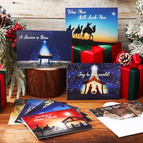 - Religious Christmas Theme: these Christmas religious greeting card covers are designed with classic nativity scenes and text, with different Bible verses and warm Christmas wishes printed inside; Warm and inspirational religious messages from the Bible, for Christmas Eve and Christmas add a touch of sweetness and warmth