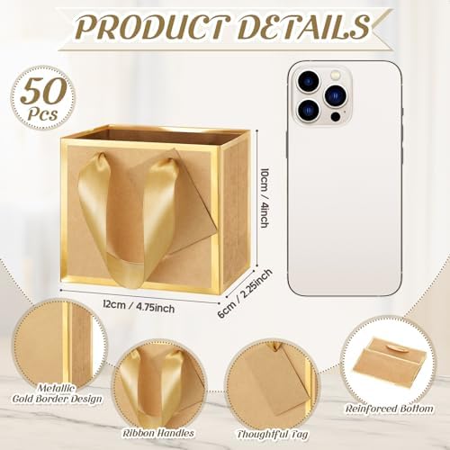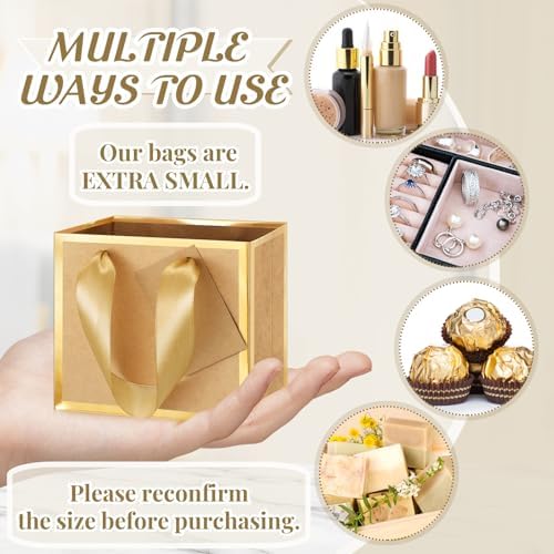 Yeaqee 50 Pcs Mini Metallic Foil Gift Bags with Handles 4x4.75x2.25'' Tiny Thank You Favor Bag with Tag for Fall Thanksgiving Halloween Christmas Wedding Baby Shower Birthday Party(Kraft, Gold)