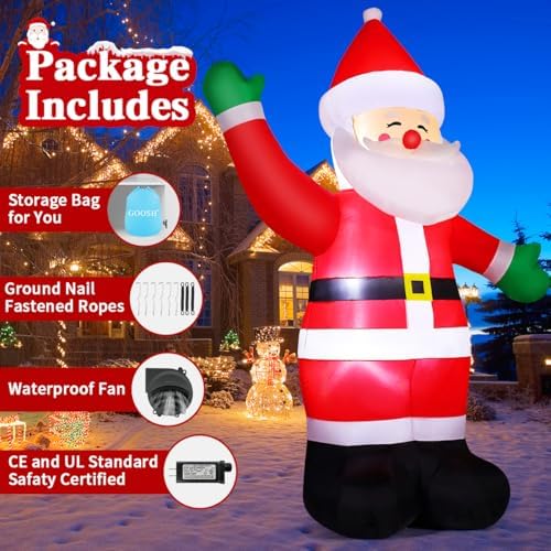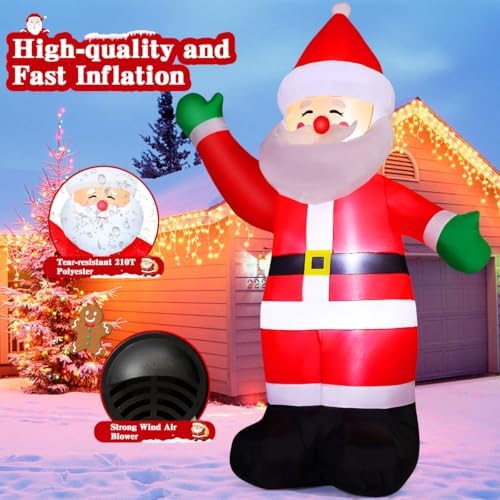 - Animated Christmas inflatables: The 8.8 FT inflatable santa is raising a hand to send a friendly greeting to everyone he encounters. In all, it is a lovable blow up santa. A pleasant holiday needs a perfect decoration as an accent. And The cute and unique appearance makes santa decorations an eye-catching presence when you put it in the yard