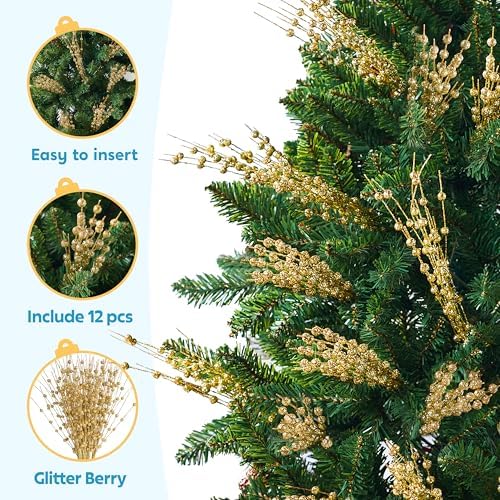 - GLITTER BERRY STEMS: One of the most striking features of our Christmas Berry Branches is the shimmering Gold berries that instantly catch the eye. With their beautiful decorative effect, they truly elevate any space and help to create a cozy and magical Christmas ambiance.Whether for home decor or as part of your holiday display, they'll set the perfect Christmas mood.