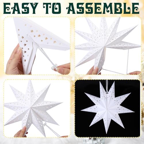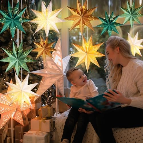 - Exquisite Nine Pointed Star Design: unveil a splendid holiday setting with our 12 piece, 9 pointed paper star set, each star is delicately handcrafted, showcasing a stunning design interspersed with a cutout star pattern, the set comes with string lights to create an awe inspired lighting spectacle that significantly amplifies your holiday decorations with an elegant touch, please note that batteries are not included