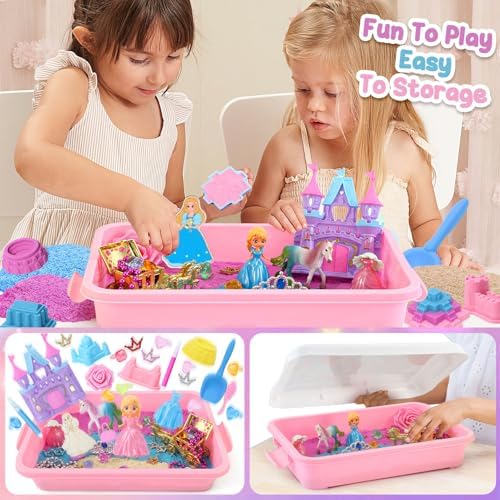 Princess Unicorn Sensory Bin Sandbox for Girl Kid Toys, 2lbs Color Sensory Sand & 6 Castle Molds & Play Kits, Sand Box Toys for Kids Girls Toddlers 3 4 5 6 7 8 Christmas Birthday Gift