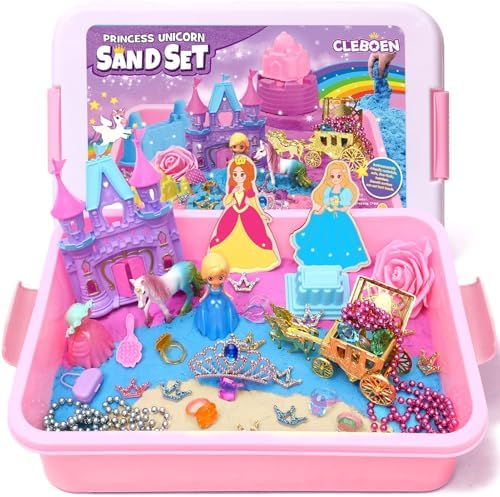 - Princess Unicorn Sensory Bin: Are you troubled by your highly active little princesses? Or unsure how to engage them in play? This set solves all your problems. Our complete play sand kit comes with a storage box, sensory sand in 3 colors, 6 castle molds and a lot of play sand kits, perfect for children aged 3-8.(Young children should play under adult supervision to prevent choking hazards from small parts.)