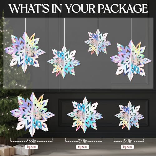 - Snowflake Ornaments for Christmas: The frozen party decorations set include 18 pieces 3D glittery Iridescent paper hanging large snowflake. The fantastic 3D hanging snowflakes can hanging on the christmas tree or the window decorations, various sizes of snowflake winter wonderland party decorations give a nicer variety on the tree
