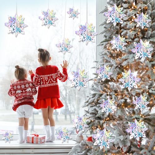 - Snow Flakes Decorating: These winter laser rainbow snowflakes clearance comes flat with string for each, easy to assemble and hang. That will sparkle beautifully under light, adding a touch of magic to your space. Unique 3D design Christmas hanging snowflakes clearance is so pretty hanging on your ceiling in the hallways,doorways or any other places you can think of,it will bring a magical atmosphere to your house