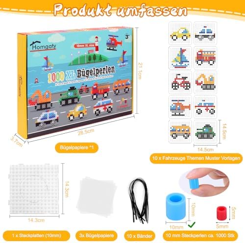- Vehicle Piecing Bead Set: Contains 1000 pcs of 10 natural color beads (10mm XL) to meet the needs of various vehicle creations. Comes with 10 templates for car themed patterns, 1 clear square pegboard, 3 sheets of iron on paper, and 10 lanyards. This arts and crafts for set has plenty of materials for multiple creations.