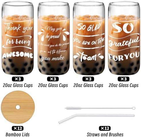 12 Set Employee Appreciation Gifts, Inspirational Thank You Gift for Team, Teacher, Nurse, Coworkers, Employees, Staff - Employee Christmas Gifts, 20oz Glass Cups with Lids and Straws (Mixed)