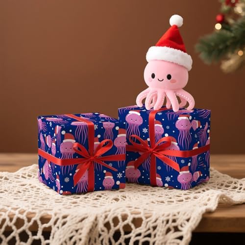- Christmas Design: This wrapping paper features an Christmas underwater world, pink jellyfish wearing a Santa hat create a fun and unique holiday scene, perfect for adding a special touch to your gifts.