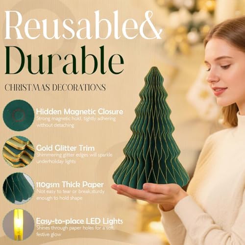 - Aesthetic 3D Design: These lighted paper Christmas tree decorations feature a unique 3D honeycomb christmas tree structure that unfolds to create a layered Christmas tree shape. Built-in 5 warm LED strings create a soft and romantic light effect through the honeycomb paper holes. Lights can be used individually without complicated wiring, easy to light up the Christmas corner