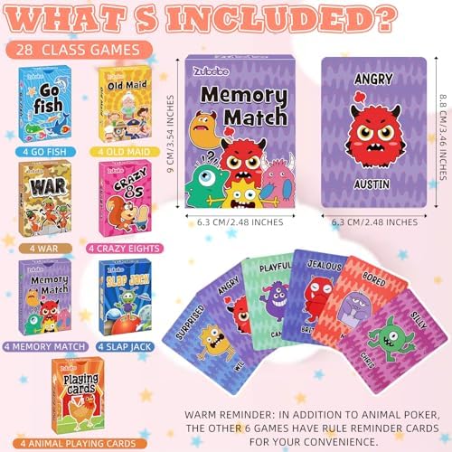 - Better Value 7 in 1 Card Game Set for Children: you will receive 28 decks of cards, including 7 classic games war, Go Fish, Old Maid, Crazy 8s, Memory Match, Slap Jack, and animal themed playing cards, 4 decks of each game style, and each deck is individually packaged; Sufficient quantity and different card games offering a wide variety of play options that keep kids engaged