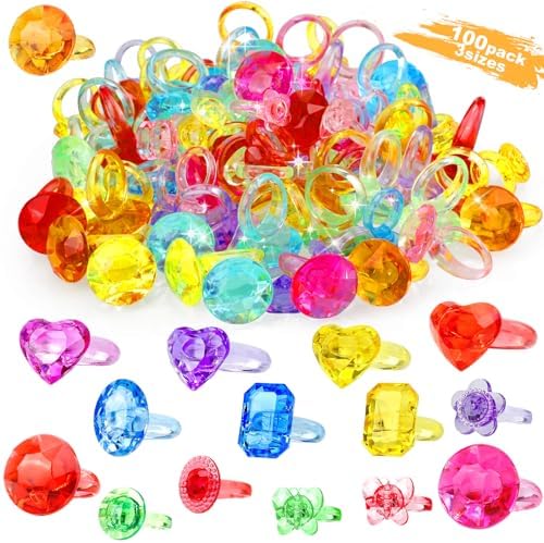 100pcs 3-Size Gem Diamond Rings Toys for kids&Unisex Adult,Bulk Plastic Ring Princess Party Favors Dress Up Jewel Ring,Goodie Bag Stuffers Fillers Carnival Prizes, Little Girl Christmas Birthday Gift
