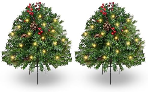 2 Pack Lighted Artificial Christmas Urn Filler 23 Inch, Battery Operated Pre-lit Mini Xmas Trees, Tripod Stake and LED Lights Christmas Porch Decorations