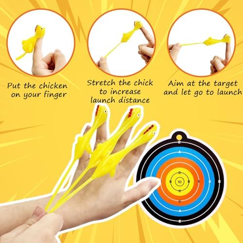 - Easy to play:Put your index finger in the hole under the flying chicken,use another hand to pull their tail,stretch and let it shoot at the target.Play with friends and see who shot further.