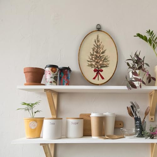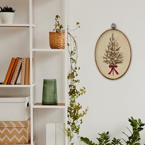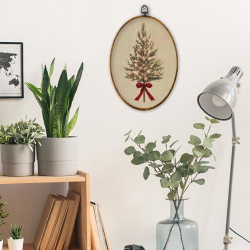 XPH Vintage Christmas Tree Oval Wall Art Framed, Rustic Coquette Red Bow Tree Oval Wall Decor, Farmhouse Cozy Christmas Hanging Canvas Prints for Home Bedroom Living Room Decoration, 8.6x11.4 Inch