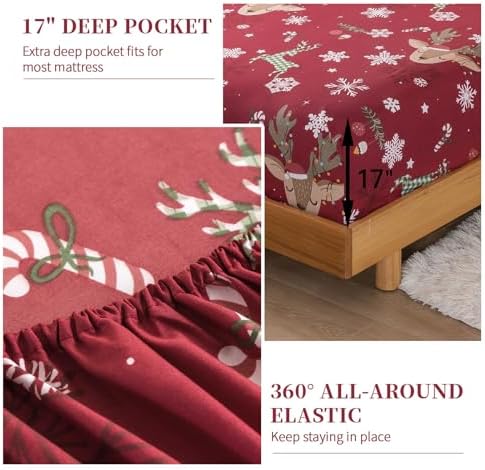 - 【4 Piece Christmas Bed Sheets】: Queen bed sheets, including 1 Flat Sheet (90" x 102") 1 Fitted Sheet (80" x 60") , and 2 Pillowcases (20" x 30") . Deep pocket fitted sheet with elastic all around.