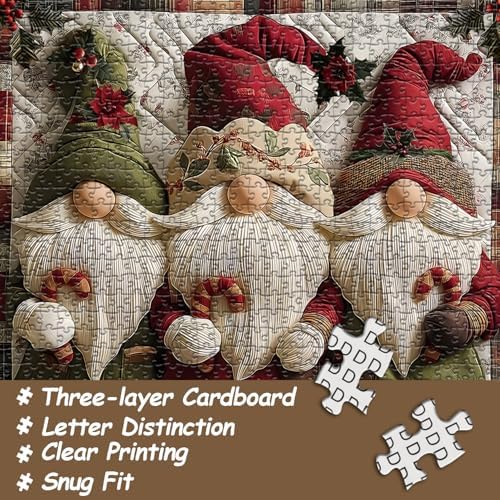 Christmas Gnome Puzzles for Adults 1000 Pieces, Unique Retro Xmas Patchwork Art Challenge Jigsaw Puzzle, Winter Holiday Vintage Christmas Themed, Three Cute Gnomes Quilting Puzzles for Adults