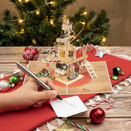 - ✨ [𝐁𝐞𝐚𝐮𝐭𝐢𝐟𝐮𝐥 𝐃𝐞𝐬𝐢𝐠𝐧]: A festive and playful 3D scene featuring cats climbing and playing on a cat tree, surrounded by colorful ornaments, pine tree, shiny balls, and neatly wrapped presents. The vibrant details bring the joy of the holidays to life, making this card a delightful surprise for cat lovers and a charming decoration for the christmas season.