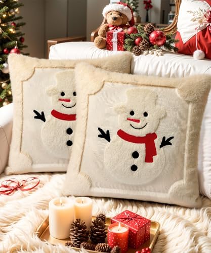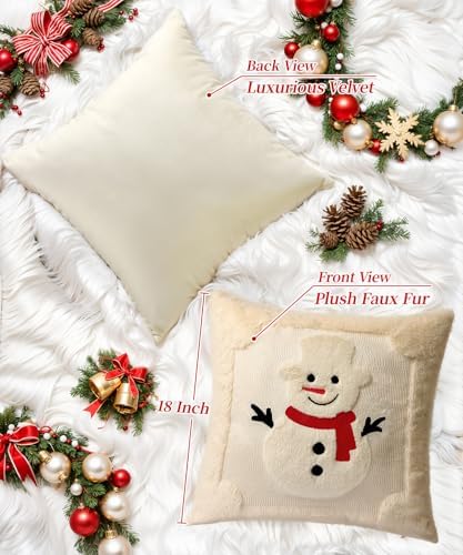 Christmas Pillow Covers 18x18 Set of 2 Decorative Soft Plush Faux Rabbit Fur Christmas Snowman Pillow Covers Beige 3D Embroidered Couch Cover Sofa Bedroom Living Room Holiday Winter Home Decor